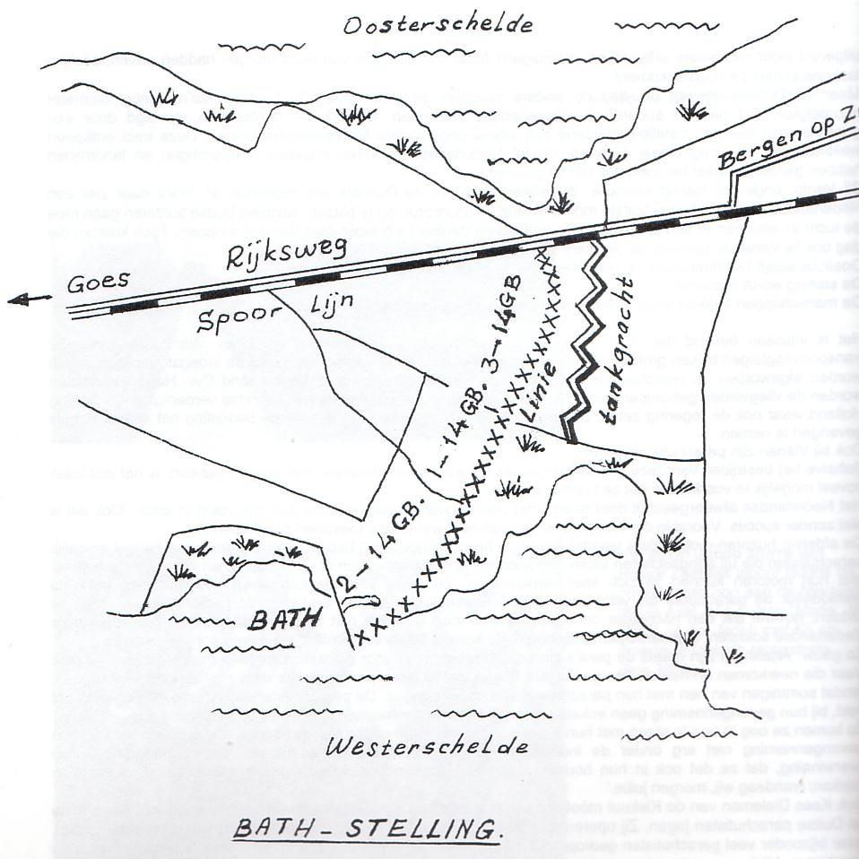 1 De Bathstelling De Bathstelling, gelegen bij het voormalig Fort Bath ( bij de Kreekrakdam), was tijdens de mobilisatie in 1939 aangelegd door het 14e Grensbataljon onder commando van Maj.F.G. Triebel. De stelling bestond uit loopgraven, versterkt met zandzakken en prikkeldraad en was uitgerust met een tankgracht, 12 kazematten, mitrailleursnesten en een geїnundeerd terrein. De Bathstelling fungeerde als voorpostenstelling van de Zanddijkstelling. |