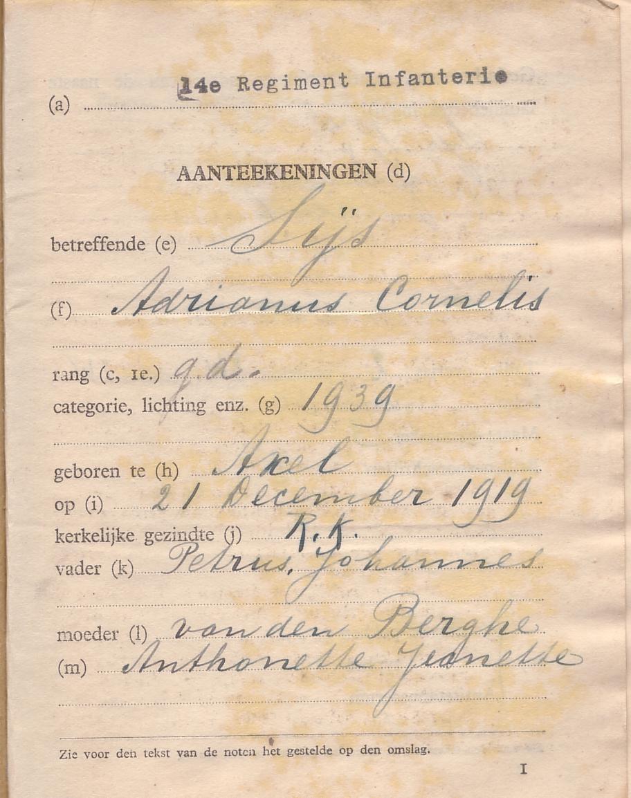 Het verhaal begint in oktober 1938. Adriaan werd opgeroepen voor militaire dienst in Bergen op Zoom (Oranje Nassau kazerne) voor een periode van 5 maanden. Hij werd ingedeeld bij de derde compagnie van het vierde bataljon van het veertiende Regiment Infanterie als mitrailleurschutter. |