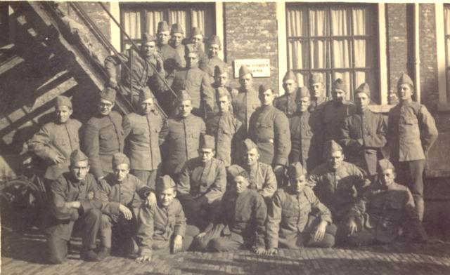 Voor zover mogelijk, uit Adriaan’s geheugen bovengehaalde namen en woonplaatsen van personen op bovenstaande foto; Van links naar rechts zittend; X uit Zierikzee, Reffeltrad was Joods en schijnt in Auschwitz te zijn omgekomen, Tentij , Swart uit Middelburg (onderw.), Schoolmeesters uit Noord- of Zuid-Beveland, de drie mannen daarnaast zijn onbekend, de laatste persoon komt uit Wemeldinge. De eerste staande rij van links naar rechts; X (Joods) uit Amsterdam, X uit Middelburg, X uit Flakkee, Jan Stuiver uit Den Haag, X uit Baarland, sergeant X uit X, Jozef Triest uit Axel, Triau uit Oostburg, en als laatste De Ruyter uit Aardenburg. De op één na laatste rij van links naar rechts; Kees Schot uit X, Adriaan zelf, vervolgens staan er nog 5 personen waarvan Adriaan de namen niet meer weet. Van de laatste rij herinnert Adriaan zich alleen de derde persoon van links, dat is ‘De Rosten’ Troost uit Ouddorp. | |