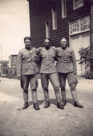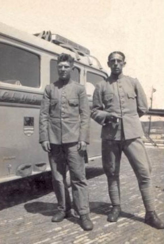 Fig.7 Adriaan met zijn dienstmaten bij de barakken van de Bathstelling. |