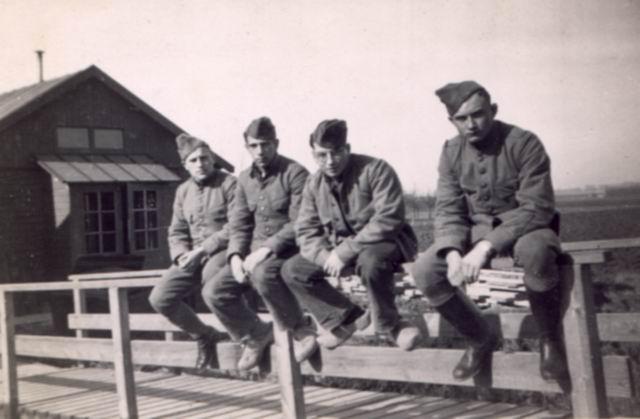 Op fig. 6 is Adriaan met zijn maten te zien bij de barakken die dienden als onderkomens voor de soldaten die gelegerd waren bij de Bathstelling. Helemaal links op de foto zit Jan Stuiver uit Den Haag, vervolgens Adriaan zelf, daarnaast zit Jan Lauwreys uit Hulst, en als laatste korperaal Braber, die uit Noord-Beveland (Baarland) afkomstig was. Hier in Rilland-Bath waren stellingen ter verdediging van de zeedijk aangebracht, waaronder een aantal stalen kazematten. In hoofdstuk 1.2 wordt de Bathstelling verder behandeld. |