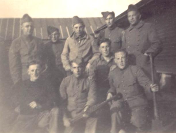 Ook op fig. 7 is Adriaan met zijn maten te zien bij de barakken, hij houdt hier een lichte mitrailleur beet. Voorste rij van links naar rechts: Arie de Visser uit Den Briel, Adriaan zelf, Cor Troost uit Ouddorp. Middenpersoon: Piet Wolters uit Zuidland, onder Rotterdam.Bovenste rij van links naar rechts: Fassaert , die een grossiersbedrijf in Westdorpe had, Borgt uit Axel ( oom van Staf Borgt) , Koster uit Baarland, Paulus Geense van de Griete en segeant majoor Wijts uit Bergen op Zoom. De schuingedrukte tekst die verder in de tekst kan voorkomen, zijn citaten uit een kort dagboek van Adriaan dat hij heeft bijgehouden tijdens de eerste oorlogsdagen en dienen als leidraad voor het verhaal.