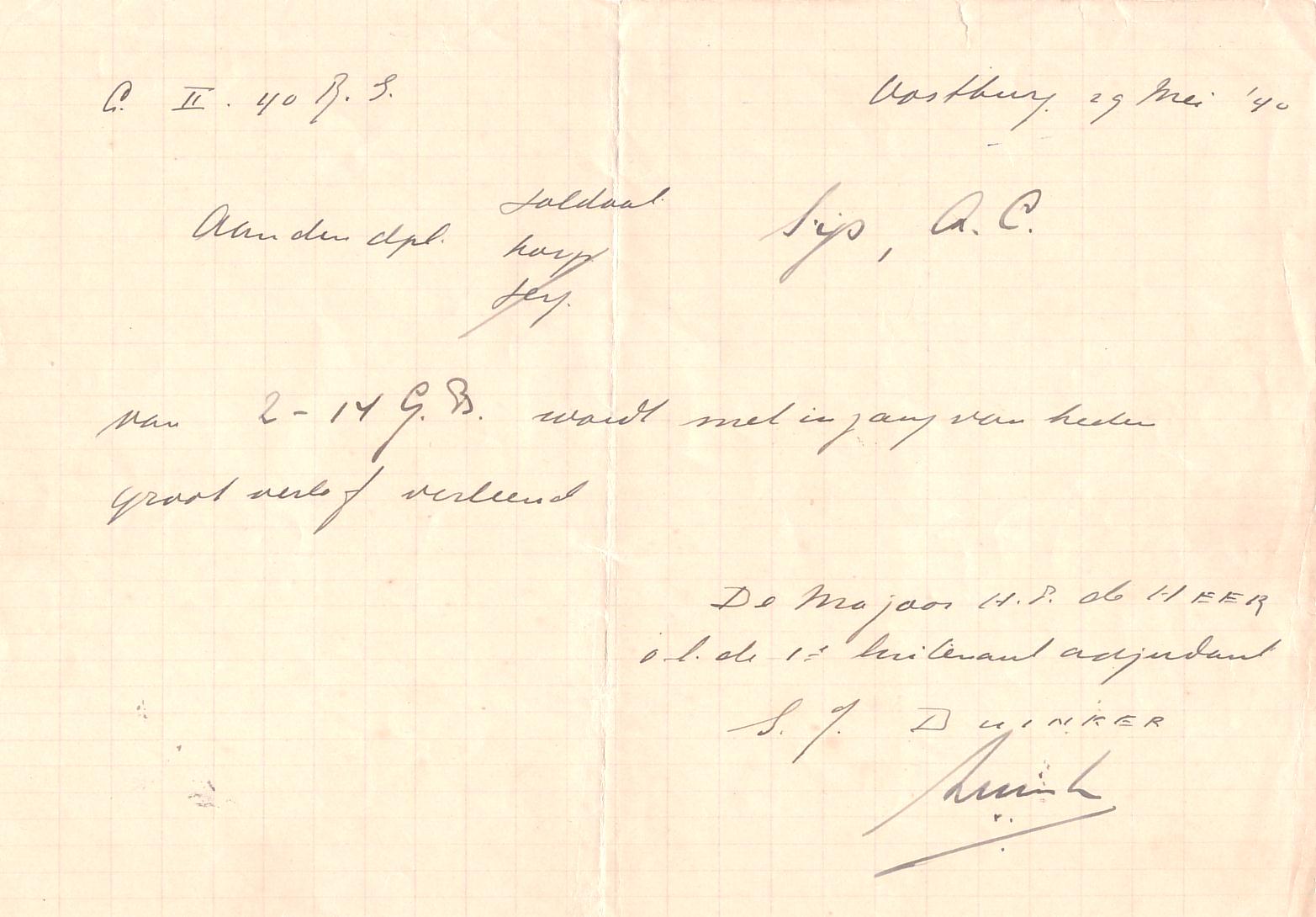 -Vrijdag 17 mei; Vertrokken vanuit Axel naar Zuidzande waar wij onze wapens in moesten leveren. Vandaar zijn wij naar Oostkerke in Belgie gegaan waar wij de nacht hebben doorgebracht in ’n schuur. Vertrokken met door het Franse leger gevorderde vrachtauto’s naar Sluis, Adriaan zat in een auto van Van Kampen. (Grossier uit Axel).Daar aangekomen, en na geslapen te hebben op straat, de volgende morgen te voet vertrokken naar Zuidzande om de wapens in te leveren bij het Franse leger. -Zaterdag 18 mei; Terug naar Zuidzande om onze wapens en zijn daar gebleven op ’n boerderij om de nacht door te brengen. -Zondag 19 mei; Terug naar Belgie nabij Ostende en hebben de nacht in ’n school doorgebracht. Per gevorderde vrachtauto is Adriaan in de richting van Oostende vervoerd -Maandag 20 mei; Wij moeten terug naar Ostende om in de kazerne te worden ondergebracht waar wij nu nog liggen in afwachting op nadere orders. -Dinsdag 21 mei; Deze avond een geweldig bombardement op Ostende met ’t gevolg ’n geweldige brand dit bombardement begon na de middag om 17 uur en om ongeveer 24 uur kwamen ze terug voor ’n tweede waarbij met mitrailleurs werd geschoten en waardoor er brandweerlieden werden gedood. -Woensdag 22 mei; Tegen den avond ’n nieuw bombardement waarbij de overdekte schietbaan werd getroffen , die net naast de kazerne ligt, zonder iemand te treffen. -Donderdag 23 mei; Van morgen zijn wij om 8 uur afgemarcheerd naar de duinen waar wij zijn gebleven tot na de middag, om 18 uur zijn wij teruggegaan. Deze middag is kalm verlopen, wel is er veel luchtalarm gemaakt, maar dat was ook alles. Zoo ook van nacht veel vliegtuigen maar verder ook niets te melden, wel zouden wij nog een schip met graan moeten lossen hebben, maar dat is niet gekomen. -Vrijdag 24 mei; Wij waren om 24 uur ’s nachts weg gegaan en om half 5 teruggekomen en zijn maar weer onder het tentzeil gekropen. Verder is er geen nieuws want het is nog maar middag, dus dat kan nog komen. Wel is het jammer dat wij niet kunnen corresponderen met thuis. Ik heb ’t wel goed gezegd en dat het nog kan komen want op ’t oogenblik staat de stad op 3 punten in brand en wel ’t militair hospitaal, de elektrisch centrale en dan nog een blok naast de kerk, en ook nog een brandje in onze kazerne. Wij waren zoo ‘ns overal aan’t rondneuzen toen ze begonnen te bombarderen. Gelukkig werd niemand getroffen , bij ons wel in de stad, daar zij 2 meisjes die in de kelder zitten opgesloten en daar kunnen ze niet bij komen. Ook in ’t militair hospitaal ging ’t er verschrikkelijk aan toe, want daar lagen nog veel gewonden in. Wij hebben gelukkig nog veel kunnen redden en ook konden de gewonden er op tijd uit. Het is nu 9 uur in de avond en wij moeten naar ’t schip toe dat gelost moet worden met levensmiddelen. Wij zijn nu terug ’t is inmiddels al 2 uur in de morgen en wij hebben midden tusschen de bommen gelegen, eerst toen wij door gingen sprong er ’n benzinetank in de lucht bij ’n garage. Toen om een uur of elf kwam ’t eerste vliegtuig weer over, kort daarop zagen wij vele lichten op gaan en daarna zijn de andere gekomen die ontzettend laag vlogen en veel bommen uitwierpen, waarvan de meeste brandbommen waren. Alles stond direct daarop in lichte laaie in de omtrek. -Zaterdag 25 mei; Wij zijn tusschen ’n rust door naar onze kazerne gelopen. Op’t ogenblik is alles nog rustig. Adriaan was dus te samen met 1200 andere Nederlandse militairen in Oostende in een kazerne geplaatst. Daar moesten ’s nachts Engelse levensmiddelenschepen gelost worden in opdracht van het Franse leger. Overdag zaten ze in de kazerne, er vlogen toen veel Duitse vliegtuigen rond. Tevens werden er door de Duitsers pamfletten uitgeworpen met de tekst dat de Nederlandse militairen moesten stoppen met het lossen van de schepen, daar anders de kazerne gebombardeerd werd. Adriaan heeft nog lang zo’n pamflet bewaard maar is dit helaas kwijt geraakt. De sectie waartoe Adriaan behoorde,(!) weigerde vervolgens nog verder schepen te lossen. De strafmaatregel die daarop volgde, was voor het Franse leger wacht te gaan lopen, hierbij kregen ze slechts één patroon mee voor hun wapen! (Mannlicher geweer).Die avond, toen ze op wacht stonden, kwamen om 8 uur ’s avonds Duitse bommenwerpers en bombardeerden de kazerne, het generaalshuis werd geraakt en ook de kamer waar Adriaan zelf sliep. Gelukkig stonden ze op wacht met een man of twaalf. Vanuit de kazerne vluchtten in paniek diverse Nederlandse militairen weg. Deze militairen werden toen door de Franse militairen van de muur geschoten!Tevens werden bij de bombardementen de winkelwijk (Jodenwijk) en het hospitaal geraakt.Bij het ziekenhuis heeft de compagnie van Adriaan (±80 man) meegeholpen de gewonden uit het ziekenhuis te halen. De Franse en de Belgische militairen staken zelf geen hand uit volgens Adriaan! Ook in het boek; West Zeeuwsch Vlaanderen 1940 geschreven door Georges van Vooren wordt er gesproken over teruggetrokken Nederlandse militairen van diverse disciplines die via West Zeeuwsch Vlaanderen in de richting van Oostende trokken. Ook de kazerne waarin Adriaan heeft gelegen in Oostende wordt hier vermeld; Hoofdstuk 8 Nederlandse troepen, blz 43; Op 20 mei waren ongeveer 1250 Nederlandse militairen in een kazerne in Oostende ondergebracht. Omdat ze niet meer naar Engeland konden worden overgebracht werden ze na capitulatie van België teruggezonden naar West Zeeuws Vlaanderen. De sterkte was toen opgelopen naar ongeveer 1300 man. Op 29 mei kwamen ze in Oostburg aan. De volgende dagen werden ze op last van de Duitsers gedemobiliseerd. Na ongeveer een week in Oostende geweest te zijn, is Adriaan te voet naar Middelkerke gelopen met zijn sectie (richting De Panne). Daar hebben ze in een school een aantal nachten doorgebracht. Overdag veel activiteit van Duitse vliegtuigen. Vervolgens uit eigen initiatief langs de kust, over het strand, met een man of 5, 6 naar Duinkerken gelopen. Hier 1 dag geweest, in Duin