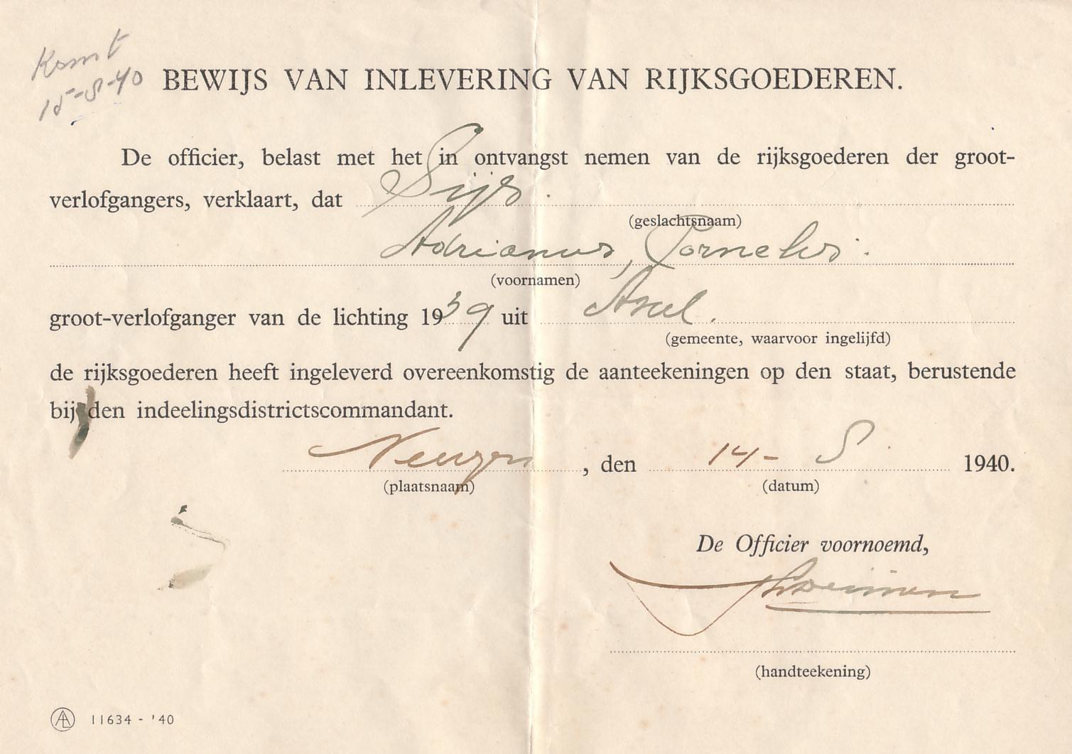 Twee man van de compagnie; Jan Stuiver en Janus Kroone hebben nog in de Julianastraat bij Adriaan thuis overnacht. De volgende dag zijn deze mannen door Adriaan samen met Jan Lauwreijs uit Hulst, per fiets, weggebracht tot Nieuw-Namen. Ze hebben hier hun fietsen geparkeerd omdat ze bang waren dat deze in beslag zouden genomen worden. Te voet werd er toen verder gelopen naar Kallo waar Jan Stuiver en Janus Kroone met een scheepje over de Schelde werden gebracht. Adriaan en Jan Lauwreijs hebben zelf de fietsen terug opgehaald en zijn weer naar Axel afgereisd. Uiteindelijk heeft Adriaan zijn uniform nog ingeleverd in Terneuzen op de Markt in de oude HBS die inmiddels is afgebroken Adriaan was mitrailleurschutter en helper geweest en deze hadden een FN- dienstpistool. Dit pistool had Adriaan de gehele tijd meegesmokkeld tussen zijn beenwindsels, zelfs bij het ophalen van het demobilisatieformulier. Gelukkig werd hij daar niet gefouilleerd, want dan was dit verhaal waarschijnlijk toch anders verlopen. Dit pistool heeft Adriaan uiteindelijk in 1940, uit geldnood, tezamen met drie volle patroonhouders verkocht aan een Belgische Kommies. |